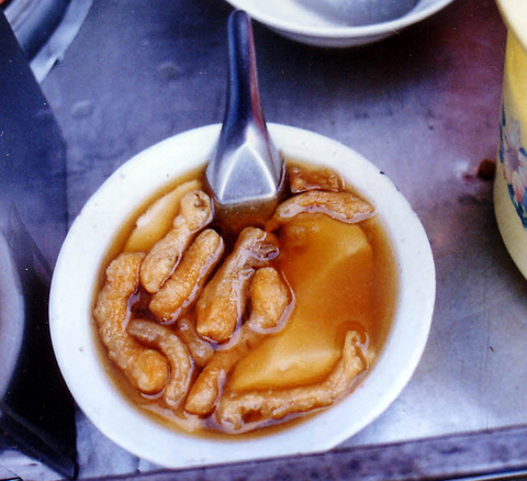 そこで翌日また屋台が来た時に、今度はオイラの分も頼んでもらって弟と一緒にじっくり食べてみました。そこでわかった事は、豆腐だ。甘くないカリントウが浮いてるんだ。生姜湯に砂糖たっぷりぶち込んでる液体なのだ。ただ、それだけのの物なのだ。