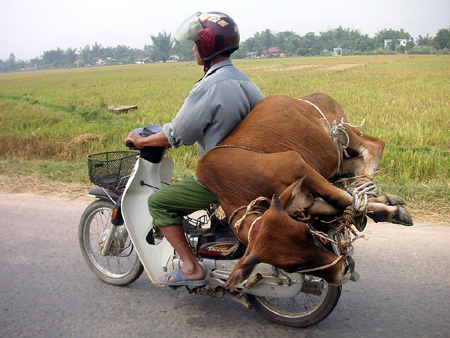 ベトナムの各地では自転車、シクロー、それにバイク(カブ)による運び屋が活躍している。犬、豚、大魚などは朝飯前! ご覧のように牛まで運んでしまうのだから驚く。 が、彼ら曰く「こんな物ぐらいで驚いちゃいけないよ! 俺たちの親父などは戦争中、武器弾薬はおろか戦車まで解体して自転車に乗せ、山岳を運んだんだぜ!」(文: Mac)(写真: 豚椀 in LAOS)